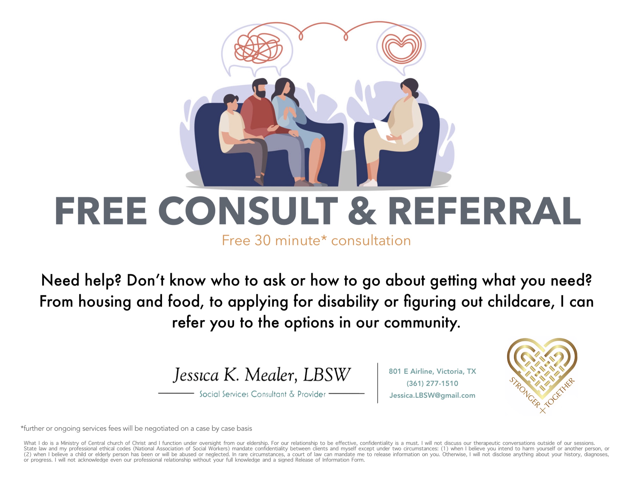 STRONGER TOGETHER. Often in the midst of difficulties, people feel lost on where or to whom to look for assistance. Our culture also makes people feel incompetent and vulnerable if they seek help. This is simply not true. Empowering people is a passion of mine. I love to educate and connect people with what they need to get through difficulties and re-discover the purpose. We are stronger together in the community and the support you need it’s only one consult away.